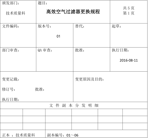 6、設備科:負責高效空氣過濾器計劃審核,并報公司設備部審批,記錄收集與存檔管理。