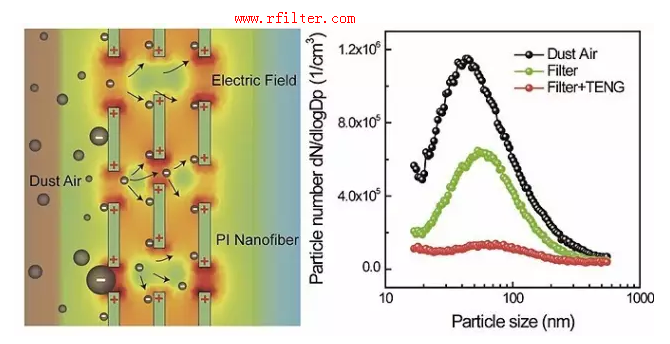 中國科學院北京納米能源與系統研究所的王中林院士和李從舉研究員(共同通訊作者)開發了一種高效旋轉摩擦納米發電機(R-TENG)增強型聚酰亞胺(PI)納米纖維空氣過濾器,用于環境氣氛中PM的去除。研究人員對不同粒徑的PM進行了過濾去除實驗,得到了具有指導意義的實驗數據。這種空氣凈化和霧霾處理的方法,具有零臭氧釋放和低壓降的優異性能。