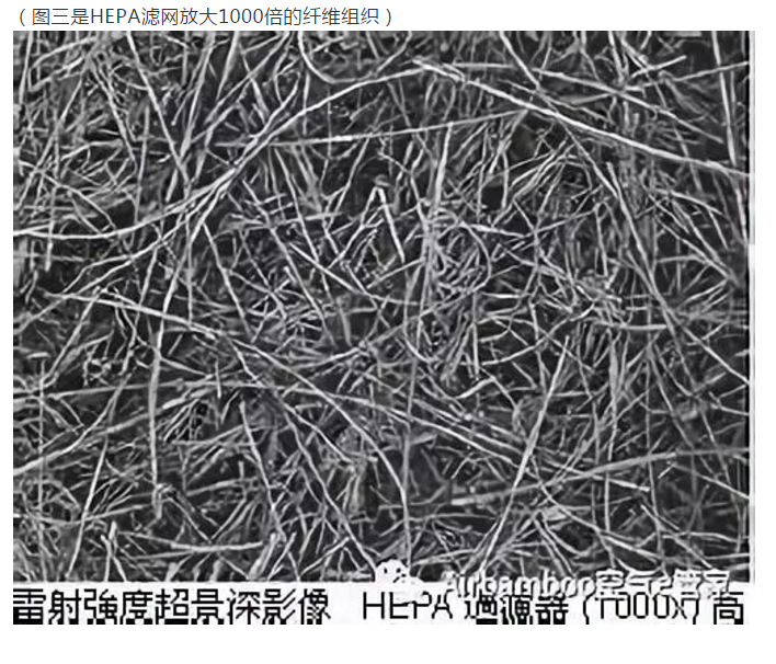 (圖三是HEPA濾網(wǎng)放大1000倍的纖維組織)